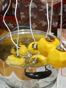 へたの部分にひもを結びつけ、柿を熱湯に浸します。この作業をすることで、カビ発生が抑えられるそうです。